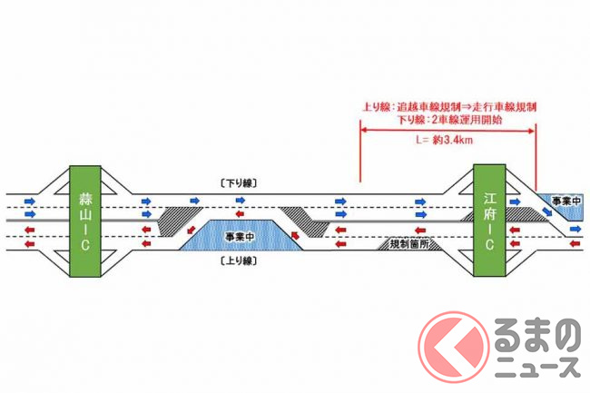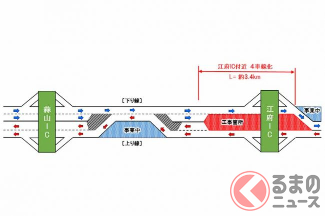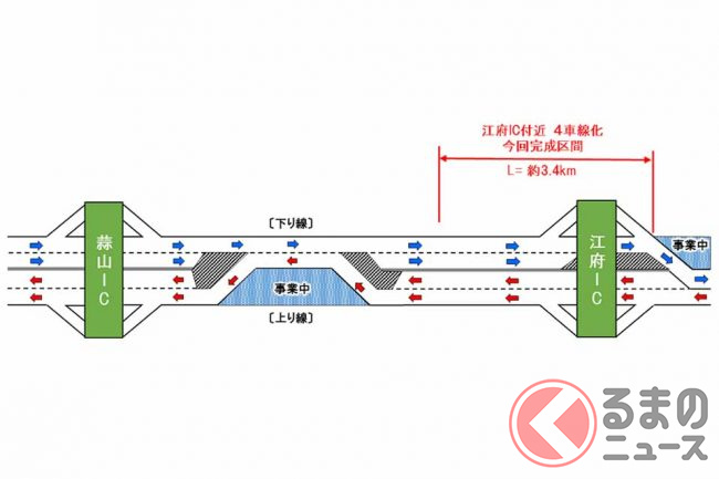 今回の完成により、江府ICを含む約3.4kmの区間で暫定2車線(片側1車線)の対面通行が解消します。