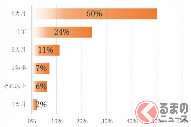 「キャンピングカーの納期いつまで待てる?」の質問では、半数が「6か月以内」を選択。続いて多い順に「1年」「3か月」「1年半」「それ(1年半)以上」「1か月」という結果でした。
