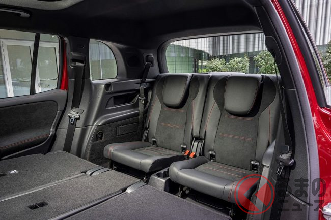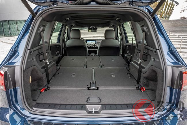 GLBと同様、3列7人乗りを実現。3列目シートを畳んだ状態では495リッターの荷室容量、2列目までたたむと最大1710リッターと広大な荷室が広がります。ただし3列目シートは身長165cmまでの乗員となっています。これもGLBと同様です。