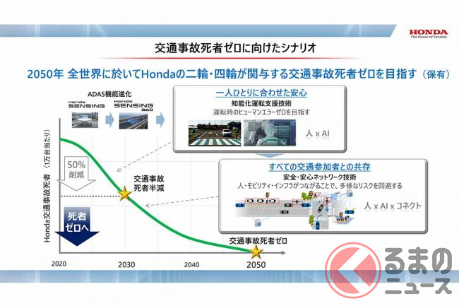 第一段階として、2030年までにホンダの二輪車と四輪車が関与する交通事故死者を現在から50%削減することを目指すといいます。