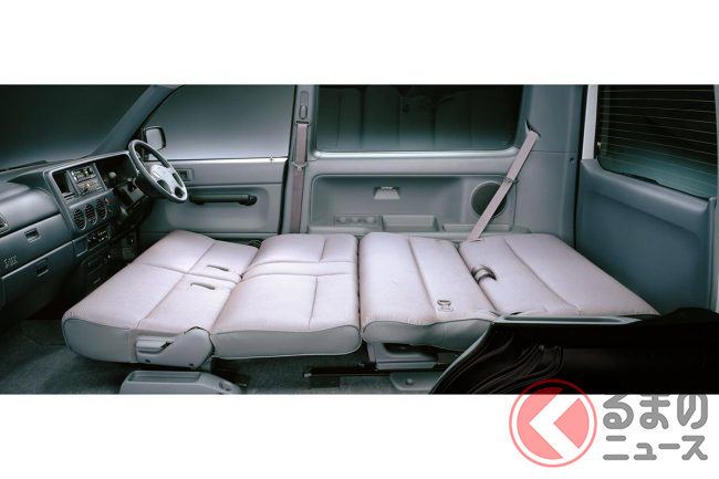 内装は前後ベンチシートの4人乗り(後に5人乗り仕様を追加)で、フルフラット化できるシートアレンジを採用し、フルフラット時は一般的なセミダブルベッドと同等のサイズとなっていました。