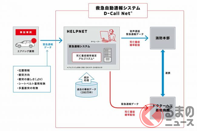 事故発生時もエアバッグ展開と連動して自動通報し、救助が必要と判断された場合は、車両情報に基づいて緊急車両などの出動要請が迅速におこなわれます。