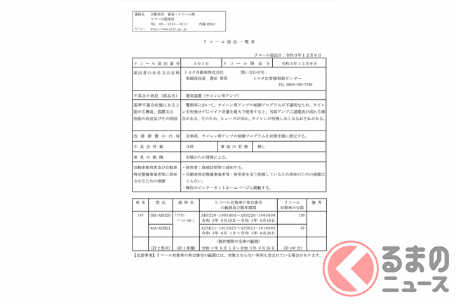 トヨタは、2021年6月から9月に生産した「クラウンパトロールカー」の一部車両について、同年12月8日にリコールを国土交通省へ届け出しました。