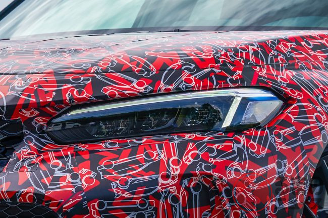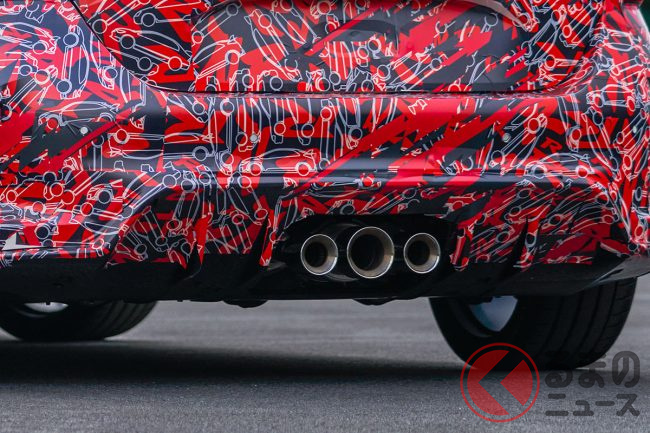 カモフラージュされた状態ではあるものの、大型リアウイングや3本出しマフラー、ブレンボのロゴが記された赤いブレーキキャリパーなどの装備を確認することができます。またバンパーの形状も標準車と異なっているようです。
