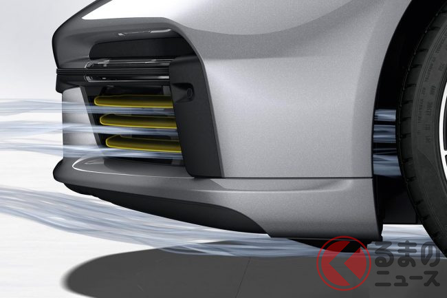 ひとつは「アクティブ エアインテークフラップ」で、フロントバンパーの左右に搭載。走行状況に応じてシャッターが開閉され、効率良く空気をラジエーターとブレーキに供給することで最適なエアロダイナミクス特性と冷却性能を確保します。