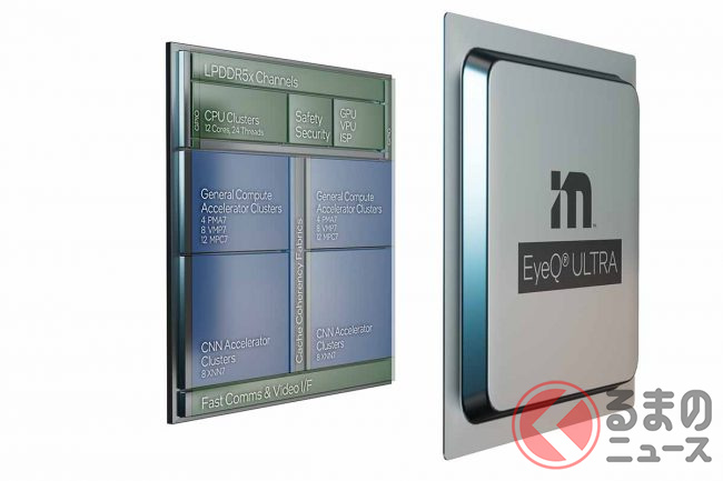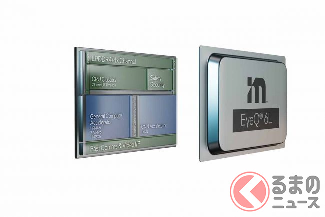 モービルアイの技術を具体的にいうと、いわゆる自動ブレーキ(衝突被害軽減ブレーキ)やレーンキープアシフト、さらには自動運転レベル2でのハンズフリー走行などで使われる、カメラによる画像認識をおこなうコンピュータチップです。