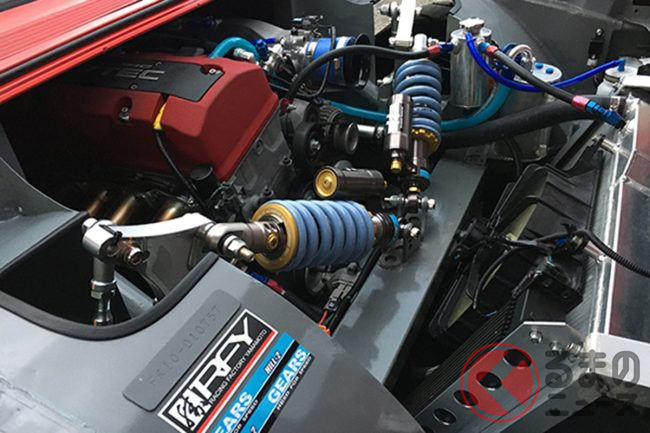 パワートレインは、S2000のF20Cエンジンにオリジナルの軽量フライホイールやボアップスロットで性能向上を図っています。