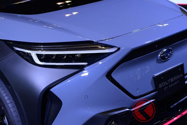 スバルの新型BEV「ソルテラ」のコンセプトカーとして「ソルテラSTIコンセプト」が初公開されました。チェリーレッドのエアロパーツを装着し、走りを予感させるスタイルを実現しています。