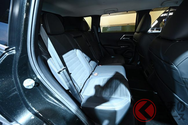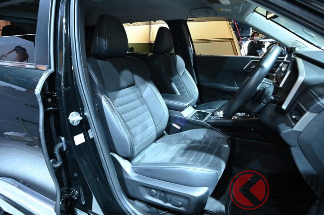 タイヤは18インチのトーヨー「オープンカントリー A/T ex」を装着しており、ホワイトレター入りのゴツいオールテレーンタイヤが新型アウトランダーをさらにワイルドに見せています。