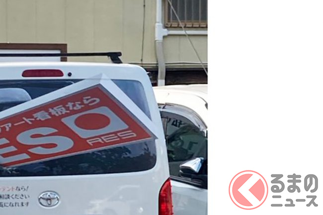 この画像を見ると、駐車場に停められている1台のクルマのリアの窓部分に看板が刺さっている光景が見られます。