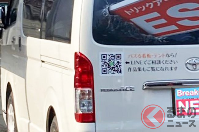 画像のトリックアートが施された部分の左下をよく見てみると、「バズる看板・テントなら! LINEでご相談ください」とLINEのQRコードがクルマに貼り付けられています。