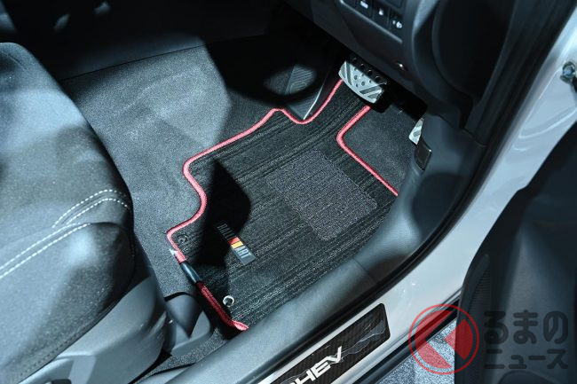 また、「RALLIART」ロゴ入りサイドデカールに加え、室内ではレッドの縁取りを施したフロアマットにもロゴが配されています。