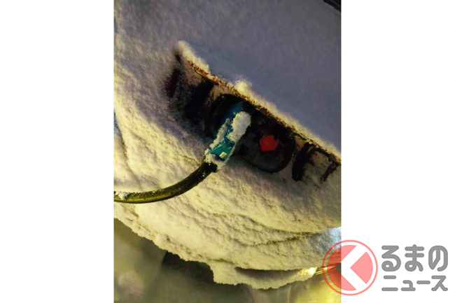 画像を見ると、充電ポートを開けて充電自体はできているものの、長時間の充電と降り続く降雪により、充電器の持ち手部分には厚く雪が積もり、充電ポートのなかには雪が入り込んでしまっています。