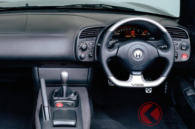 2000年には、世界初の車速応動可変ギアレシオステアリング(VGS)を搭載した「S2000 タイプV」が登場。ロックトゥロックは従来のクルマの約半分の1.4回転となっており、ステアリングは下部を水平「Dシェイプ」とするなど、よりフォーミュラーカーをイメージさせるコクピットとなっていました。