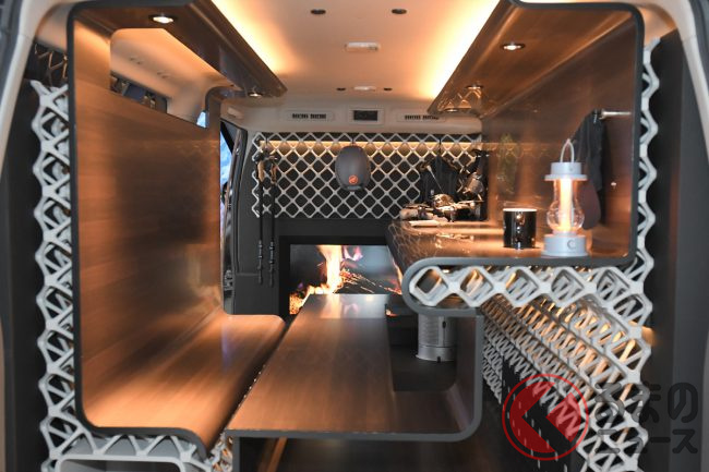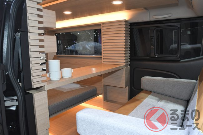 内装は大きく手が加えられており、壁・床・天井は木目調トリムが採用されたほか、回転式テーブルやソファ(専用シート)、跳ね上げ式ベッドも設置され、まるでリビングのようなくつろげる空間が広がっています。