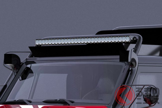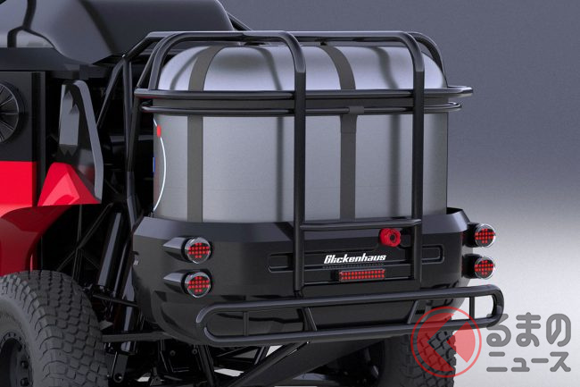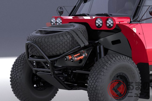 フロントフェイスは、4輪装着されたオフロードタイヤのスペアタイヤ用と思われる、5つ目のタイヤが装備されており、ルーフのLEDライトバーと相まって、迫力ある顔つきとなっています。