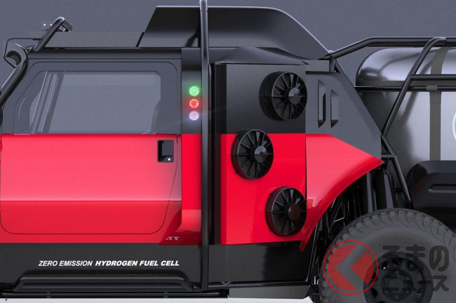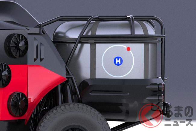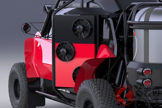 今回、SCGが発表した燃料電池バギーは、頑丈そうなパイプフレームに囲まれるようなかたちで、車両後部に水素タンクを搭載。