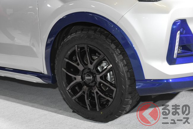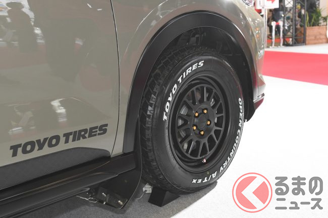 さらに、ダイハツエンブレムの代わりに「DAIHATSU」ロゴを備えるほか、タイヤはトーヨー オープンカントリーR/Tというゴツいオフロードタイヤを装着し、タフ感を演出しています。