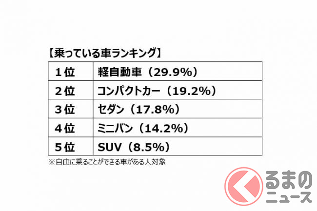 クルマはさまざまなタイプがありますが、現在乗っているマイカーのタイプを質問したところ、最多は「軽自動車」で29.9%、次いで「コンパクトカー」19.2%、「セダン」17.8%、4位「ミニバン」14.2%、5位「SUV」8.5%に。