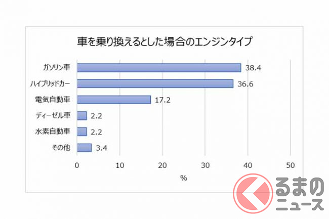 クルマを乗り換えるならば、次はどのパワーユニットが良いか聞いたところ、もっとも多かったのは「ガソリン車」で38.4%でした。