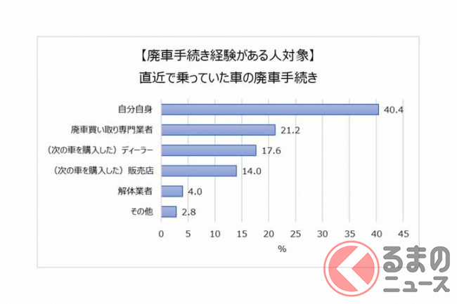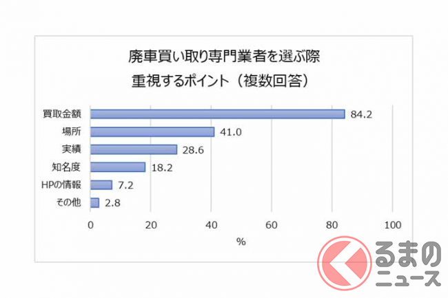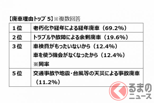 結果は、トップが「老朽化や経年による経年廃車」69.2%で、以下「トラブルや故障による余剰廃車」19.6%、「車検費がもったいないから」「車を使う機会がなくなったから」いずれも12.4%、「交通事故や地震・台風等の天災による事故廃車」11.2%です。