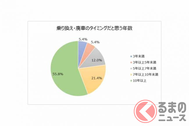 乗り換え・廃車だと思うタイミングを質問したところ、もっとも多かった回答は「10年以上」で55.8%、次いで「7年以上10年未満」21.4%でした。