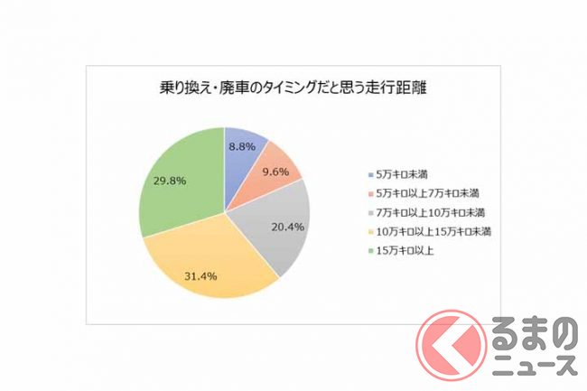 また走行距離については、多い順に「10万km以上15万km未満」31.4%、「15万km以上」29.8%、「7万km以上10万km未満」20.4%という結果でした。