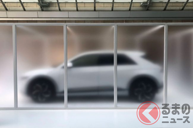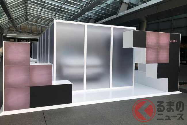 磨りガラスのなかにあるクルマの詳細は現時点では不明となっているものの、微かにわかるシルエットや、ヒョンデ(Hyundai Mobility Japan)がこれまで公式サイトなどでPRしてきた実績などから、EVの「アイオニック5」(渋谷・六本木で展示)とFCVの「ネッソ」(六本木でのみ展示)であることが予想されます。