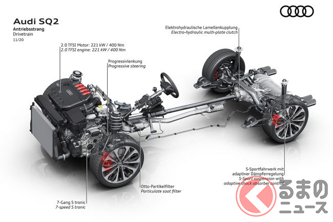 今回発表されたSQ2は、Q2シリーズのなかで唯一quattro(クワトロ=4輪駆動)を搭載する高性能スポーツバージョンです。このクワトロシステムは電子制御式油圧多板クラッチを用い、安定した加速とスポーティなコーナリング、雪上や悪天候においても高い走行安定性を実現。