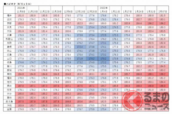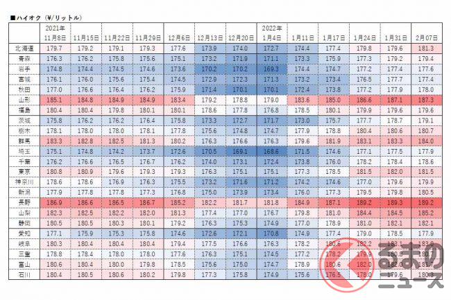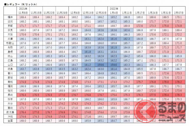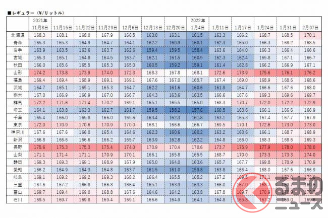 資源エネルギー庁は2022年2月9日、レギュラーガソリンの7日時点の店頭価格(消費税込)を発表しました。