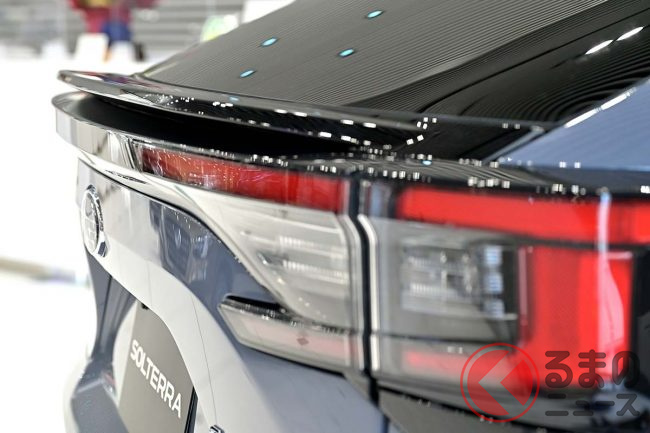 ほかのスバル車でも同じようにコの字型テールランプが採用されていても、残念ながらリアゲート側は光らない仕様が多いのですが、新型ソルテラはボディ側のランプも点灯することでワイド感も演出しています。