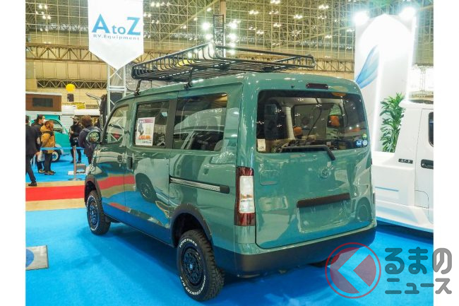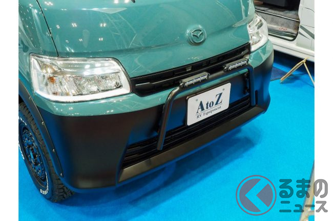 「アンナE」という車中泊モデルで、マツダ「ボンゴ」をベースに、ハイリフトサスペンション、エアロバンバー、バンパーガード、フェンダーモール、ルーフラック、オフロードタイヤを装備。