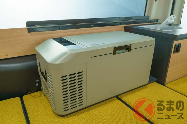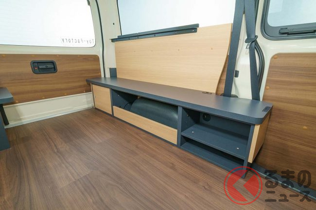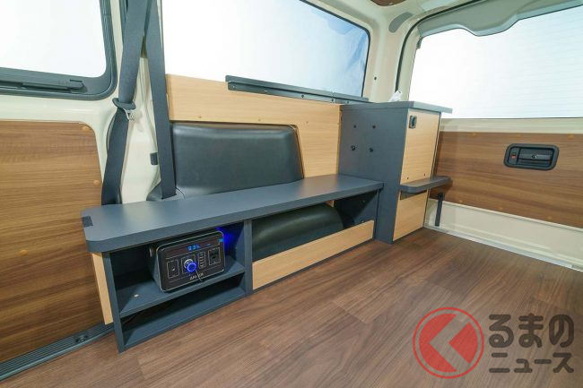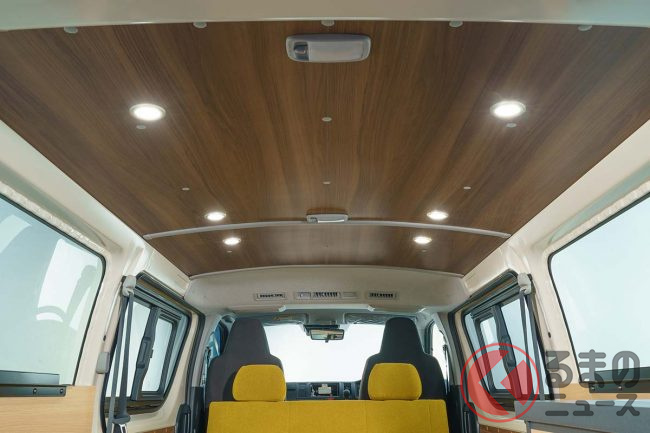 天井や壁面パネルは木目調、床面はクッションフラットフロア仕上げとし、快適なバンライフを送るためのオプション装備として、冷凍・冷蔵庫や天井LED照明なども用意しています。