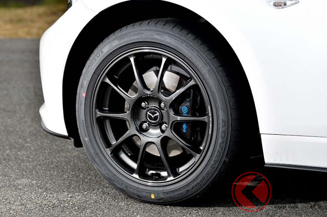 現行ロードスターのバリエーションのなかでもっとも車両重量の軽い「S」グレードをベースに、標準装備品に対して1本あたり約800g(1台分で約3.2kg)軽いレイズ製の鍛造アルミホイールを履いてダイエット。
