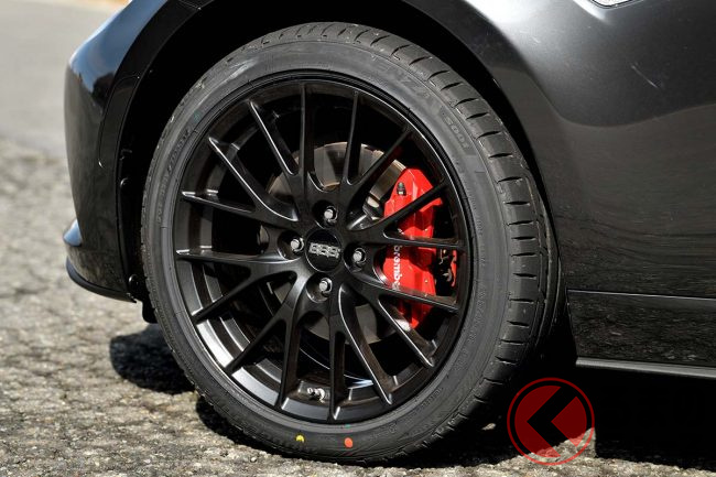 ブレーキローターはフロントが17インチ車用の大径、リアも大径ローターにノーマルと同じ形状で塗装を施したキャリパーを組み合わせて強化するなど、軽量化を施しただけでなく、ブレーキを強化しているのも注目したいポイントです。