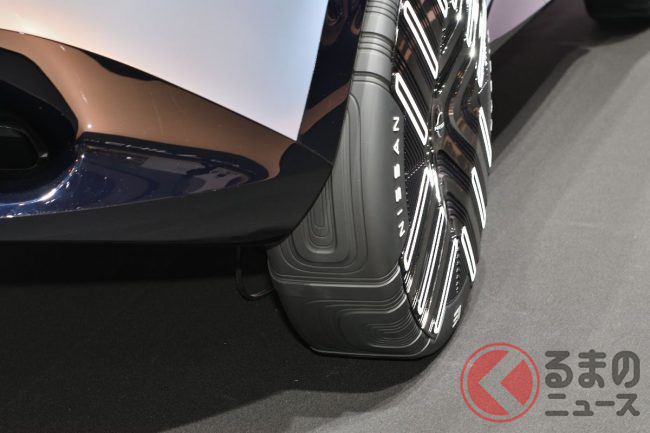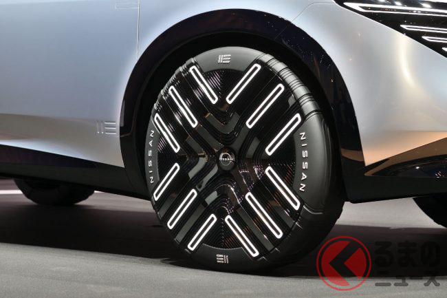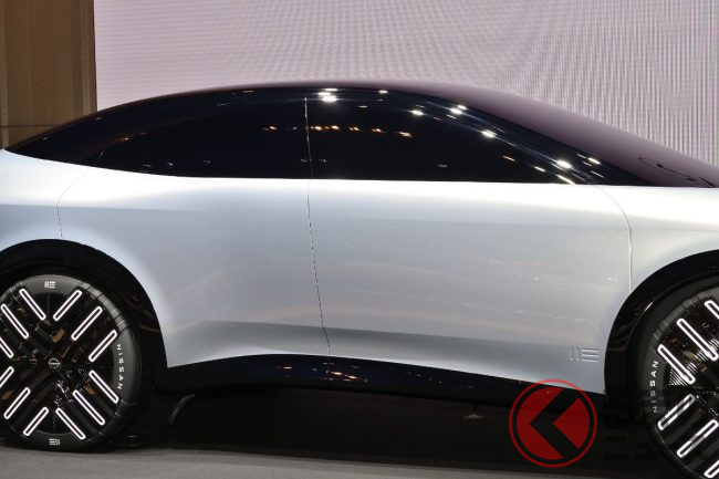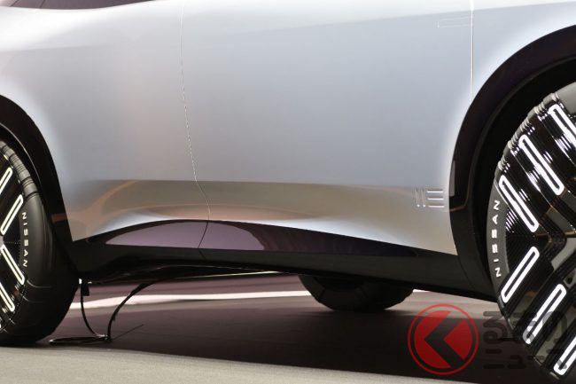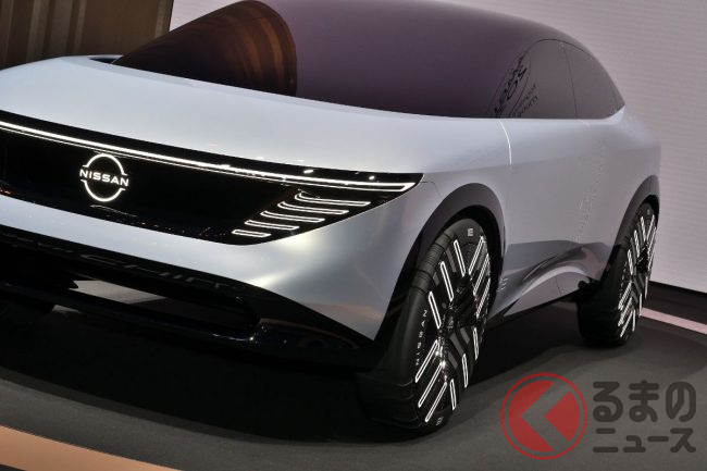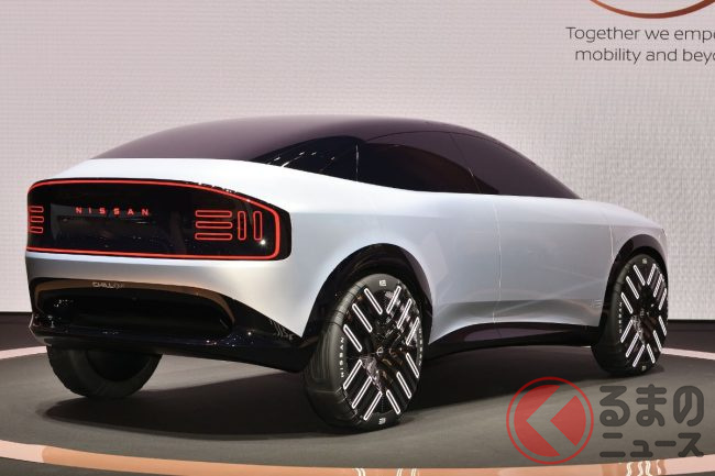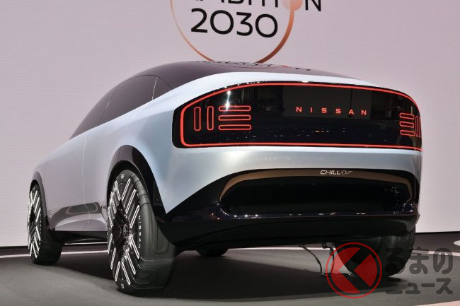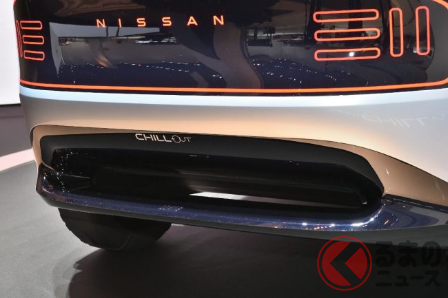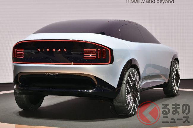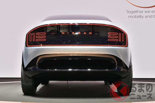 日産ロゴを装着したモデルは、2021年11月29日に世界初公開した新世代のクロスオーバーEV「NISSAN CHILL-OUT」とフロントフェイスは似ているものの、シルエットから見えるディテールやテールライトデザインは異なっています。