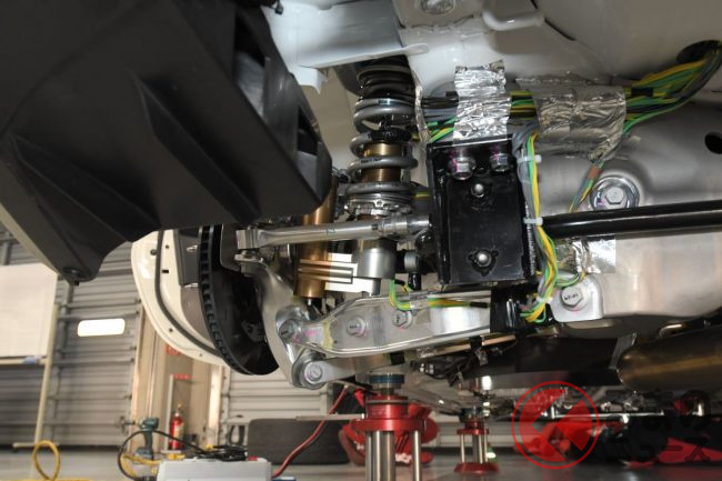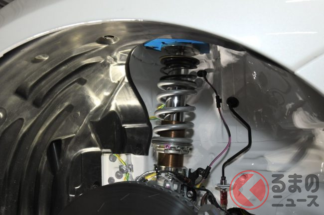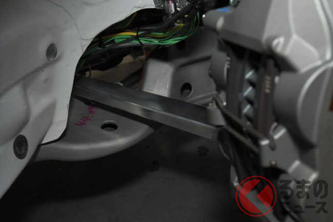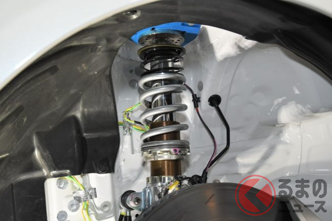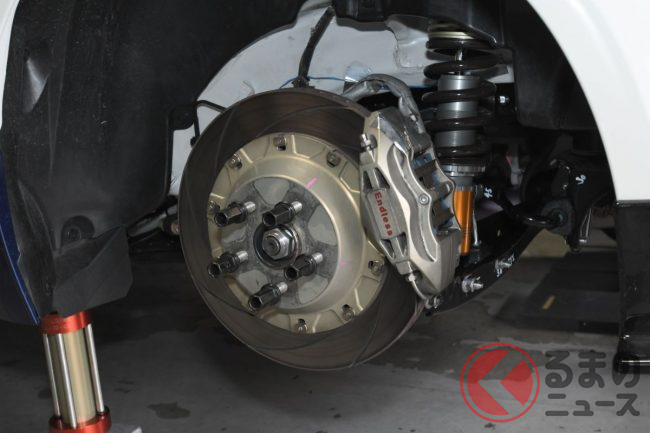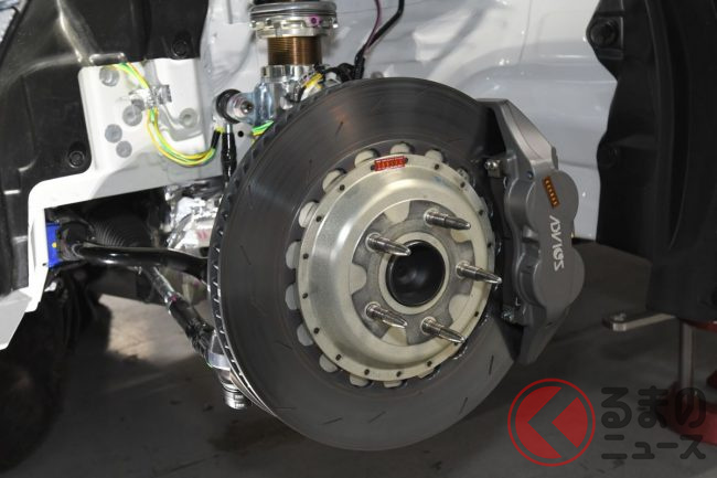 空力パーツはフロントスポイラーのみでリアウイングは未装着。ブレーキはアドヴィクス、サスペンションはKYB、エキゾーストはフジツボなのが確認できます。