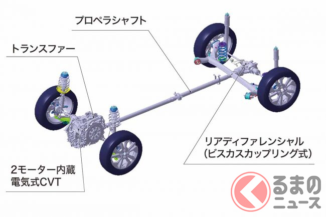ライバルは独立したモーターで後輪を駆動する仕組みが増えていますが、そうではなくビスカスカップリングを通じてエンジンやフロントモーターの力を機械的に後輪へ伝えるのが特徴です。