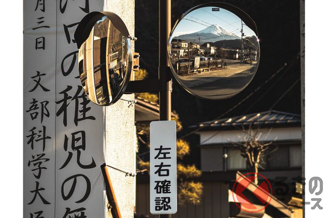 それは「左右確認」と書かれた2枚のカーブミラーの写真で、一見するとよくある道端の光景ですが、右側のミラーに 富士山がきれいに映り込んでいるのが確認できます。