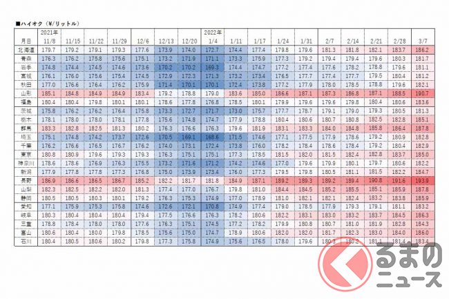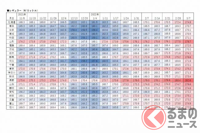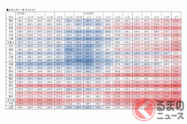 資源エネルギー庁は2022年3月9日、レギュラーガソリンの3月7日時点の店頭価格(消費税込)を発表しました。