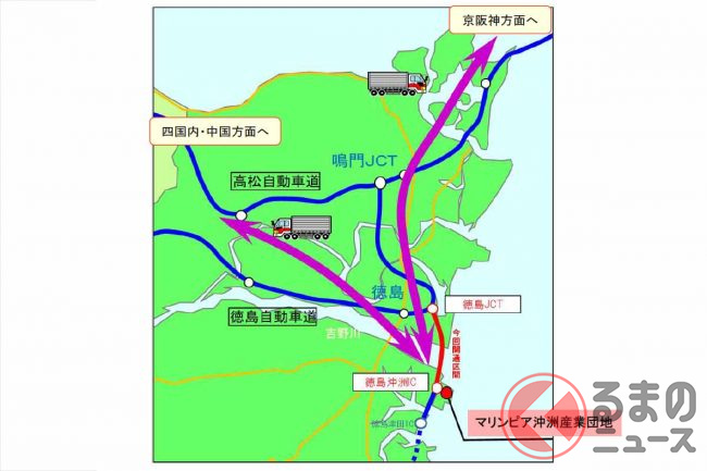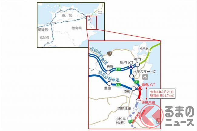 2022年3月21日、徳島南部道の徳島JCT~徳島沖洲IC間4.7kmが開通。これにより徳島道から徳島南部道の徳島津田ICまでが一本につながり、香川・淡路・関西方面と、徳島市中心部や徳島小松島港方面とのアクセスが向上します。