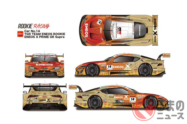 「スーパーGT」ではチーム名を「TGR TEAM ENEOS ROOKIE」とし、「ENEOS X PRIME GR Supra」というマシン名で参戦。カラーリングはENEOSのオレンジに加えてゴールド、そしてタータンチェックをあしらっています。