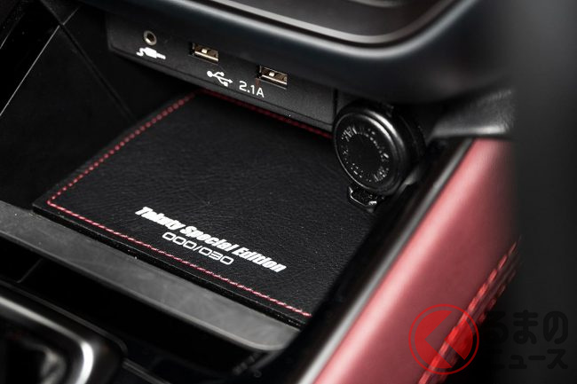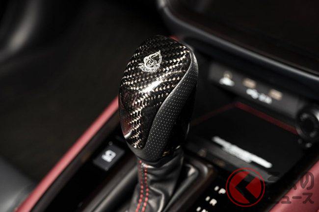 シフト回りは、リベラル製のプレミアムカーボンインテリアで仕上げられたシフトノブと、伊の蔵レザー製の車名とシリアルナンバーが入ったレザーマットが目に入ります。30台限定のシリアルナンバーは所有欲を満たしてくれるアイテムとなるでしょう。