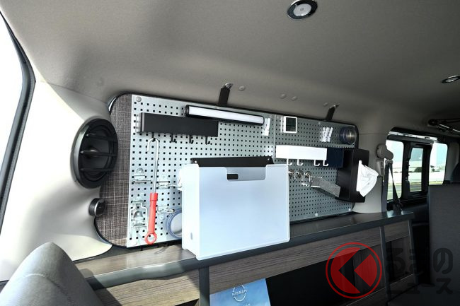 外装もブラックで統一され、精悍なイメージとしていますが、ボディサイドに海と山のアクティビティをペイント。加えて、パソコンを使って仕事をする人も描かれており、アウトドアレジャーだけでなく、ワーケーションも可能とするモデルに仕上がっています。