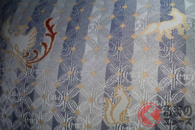 座席には、MKタクシーのロゴや七宝模様のモノグラムにキツネや鳳凰をあしらった西陣織を採用。素材は、SDGsの観点から再生PETの糸を使ったそうです。