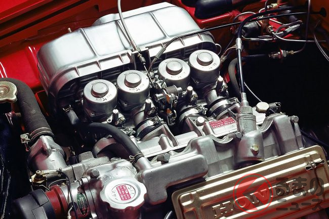 606ccと今の軽自動車よりも小さいエンジンは直列4気筒DOHCで、4つのキャブレターを装備。最高出力57馬力を発揮し、最高回転数も9000rpm以上で、当時としてはずば抜けた性能を誇りました。