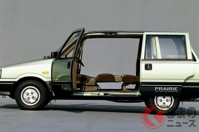 プレーリーは新ジャンルのクルマとして開発されたモデルで、後部ドアは両側スライドドア、しかもセンターピラーレスを採用し、内装は8人乗り3列シートと5人乗り2列シートを設定するなど、現在のミニバンの要素を確立していました。