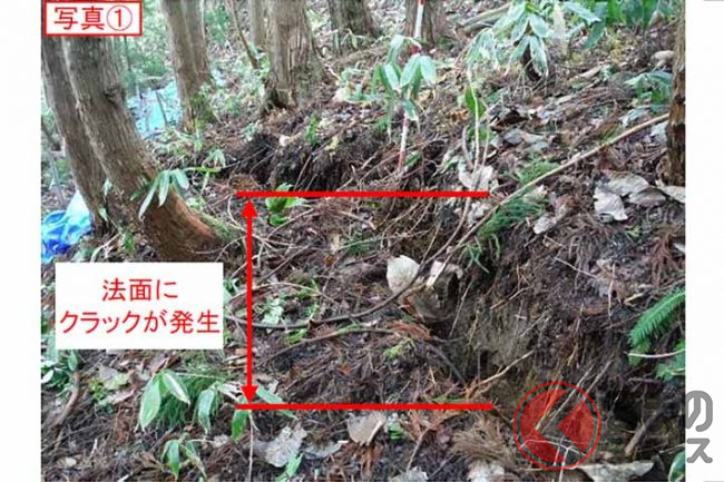 その後、調査を進めたところ地滑りの発生が確認できたため、地質調査や変位の観測などをおこなっています。