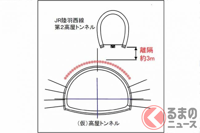 途中の高屋道路(延長3.4km)の計画区間では、既設の陸羽西線のトンネルからわずか約3mの間隔で道路トンネルを通すことになることから、工事を安全・効率的に進めるため陸羽西線の列車を運休させます。