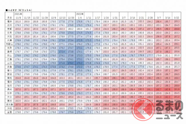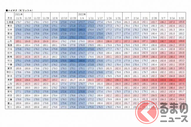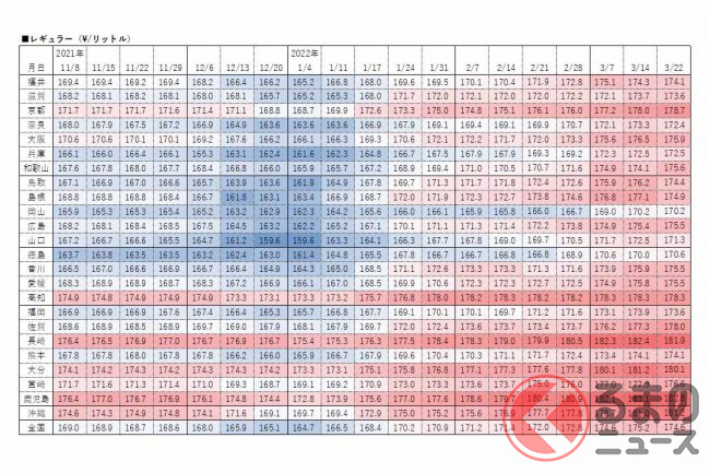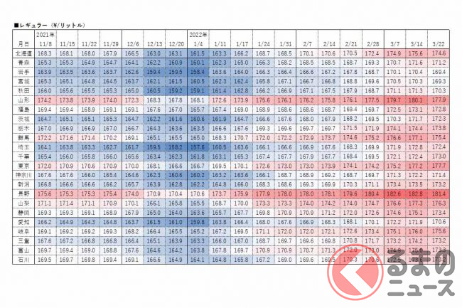 資源エネルギー庁は2022年3月24日、レギュラーガソリンの3月22日時点の店頭価格(消費税込)を発表しました。